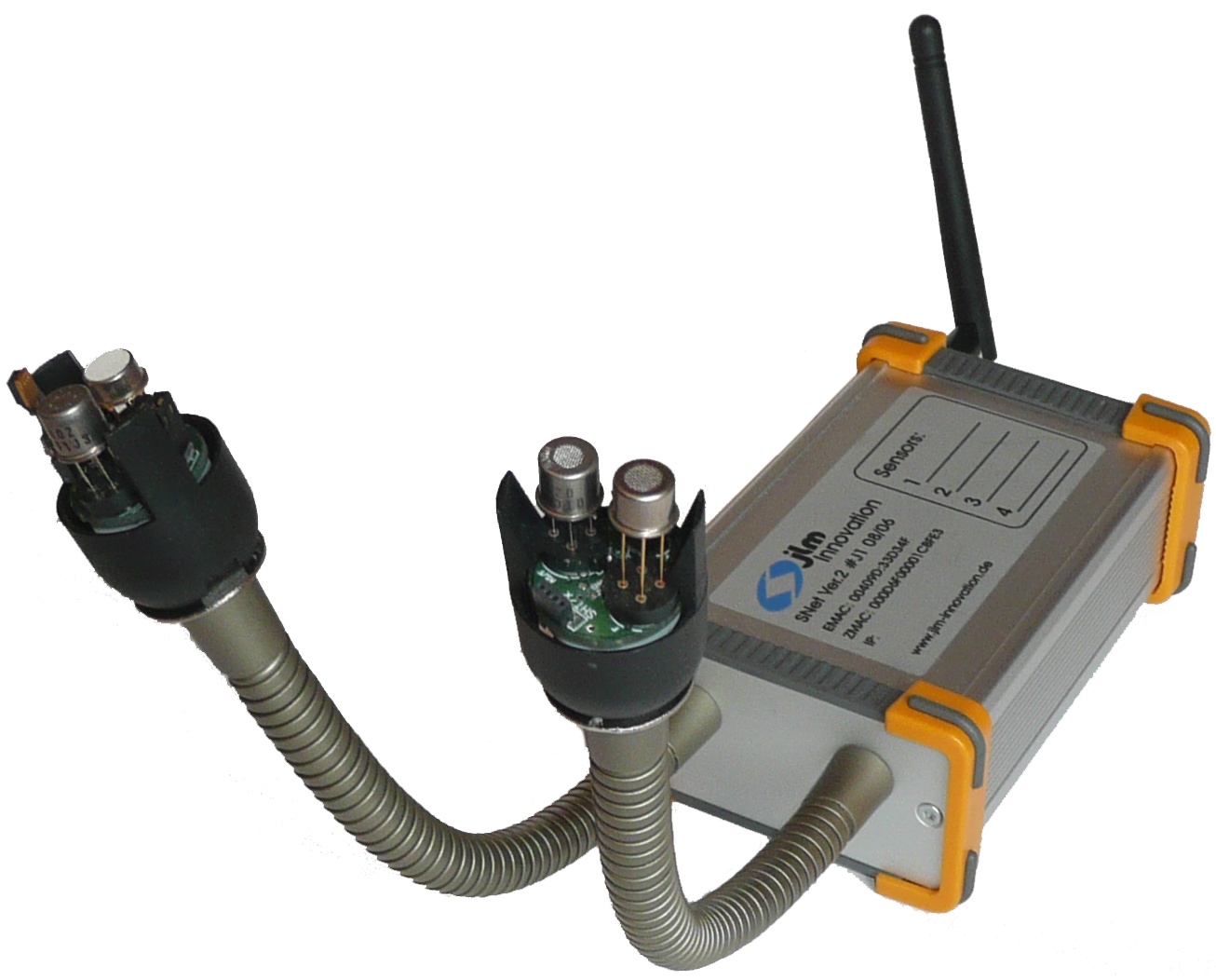 SNet sensor modules can be equipped with 4 metal oxide sensors and a humidity and temperature sensor. Heater voltages can be set for each sensor individually, allowing to combine a broad range of sensors from various manufacturers. The heater voltages may be modulated to generate additional information per sensor.